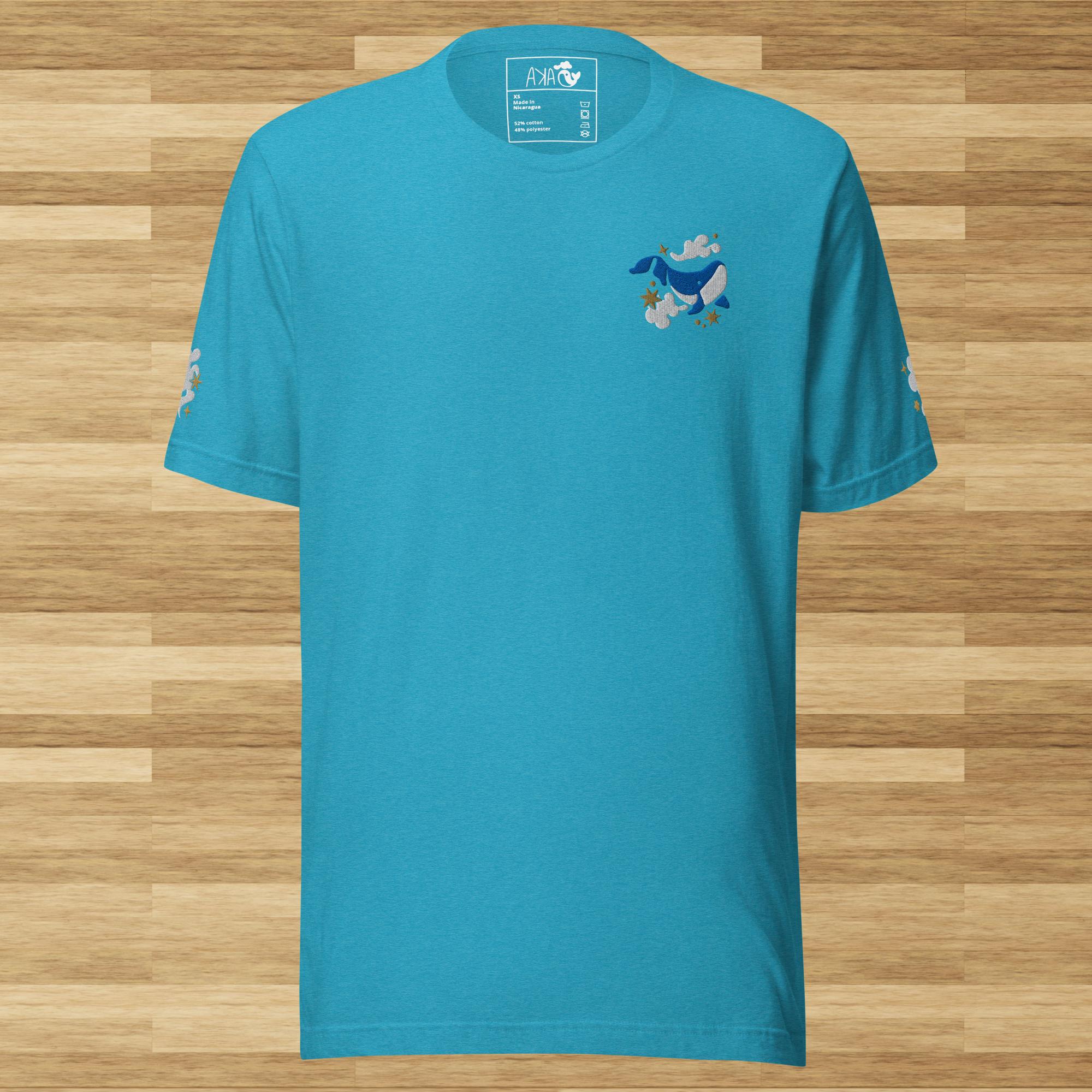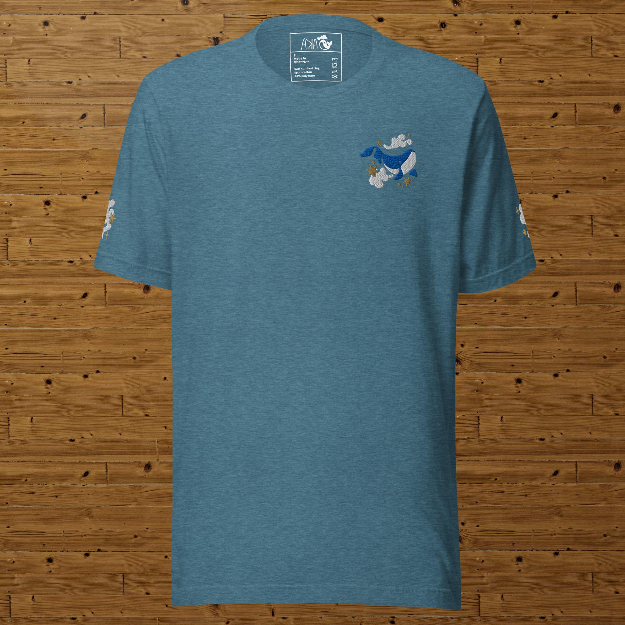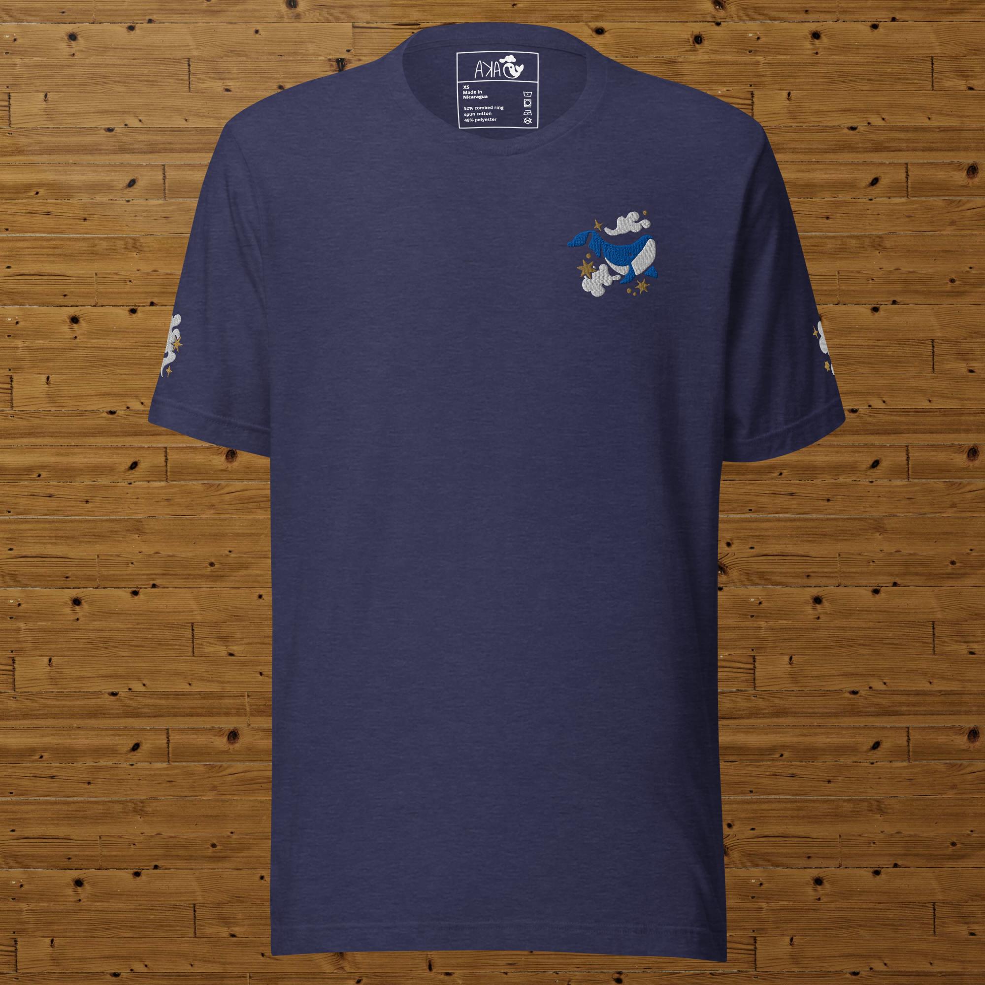 Germaine la Baleine flotte parmi les étoiles, apportant sérénité et douceur. Ce t-shirt, brodé sur les manches et la poitrine est très confortable, pour un look à la fois décontracté et original.